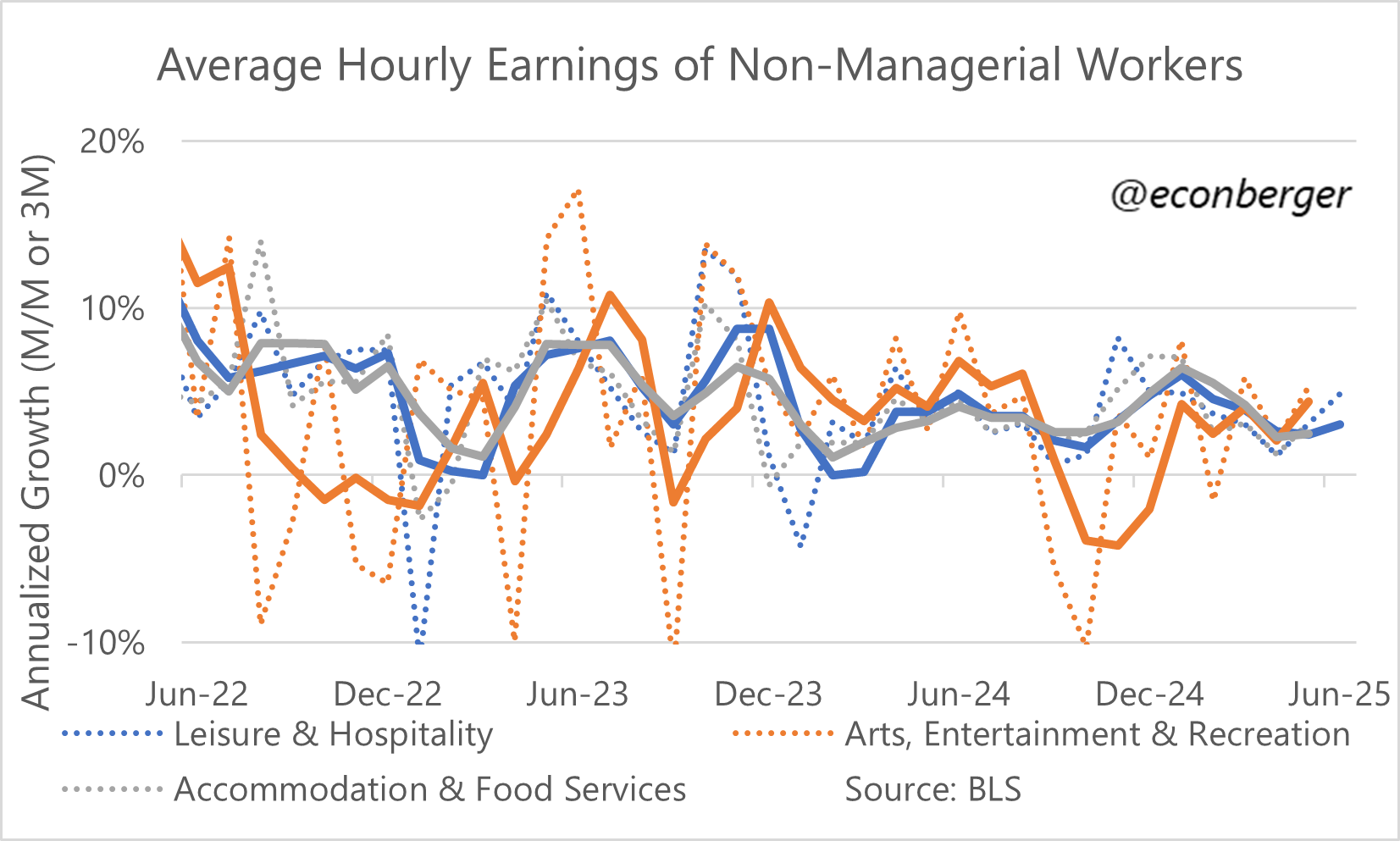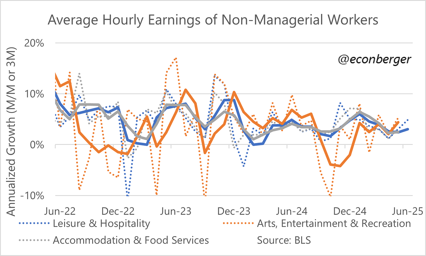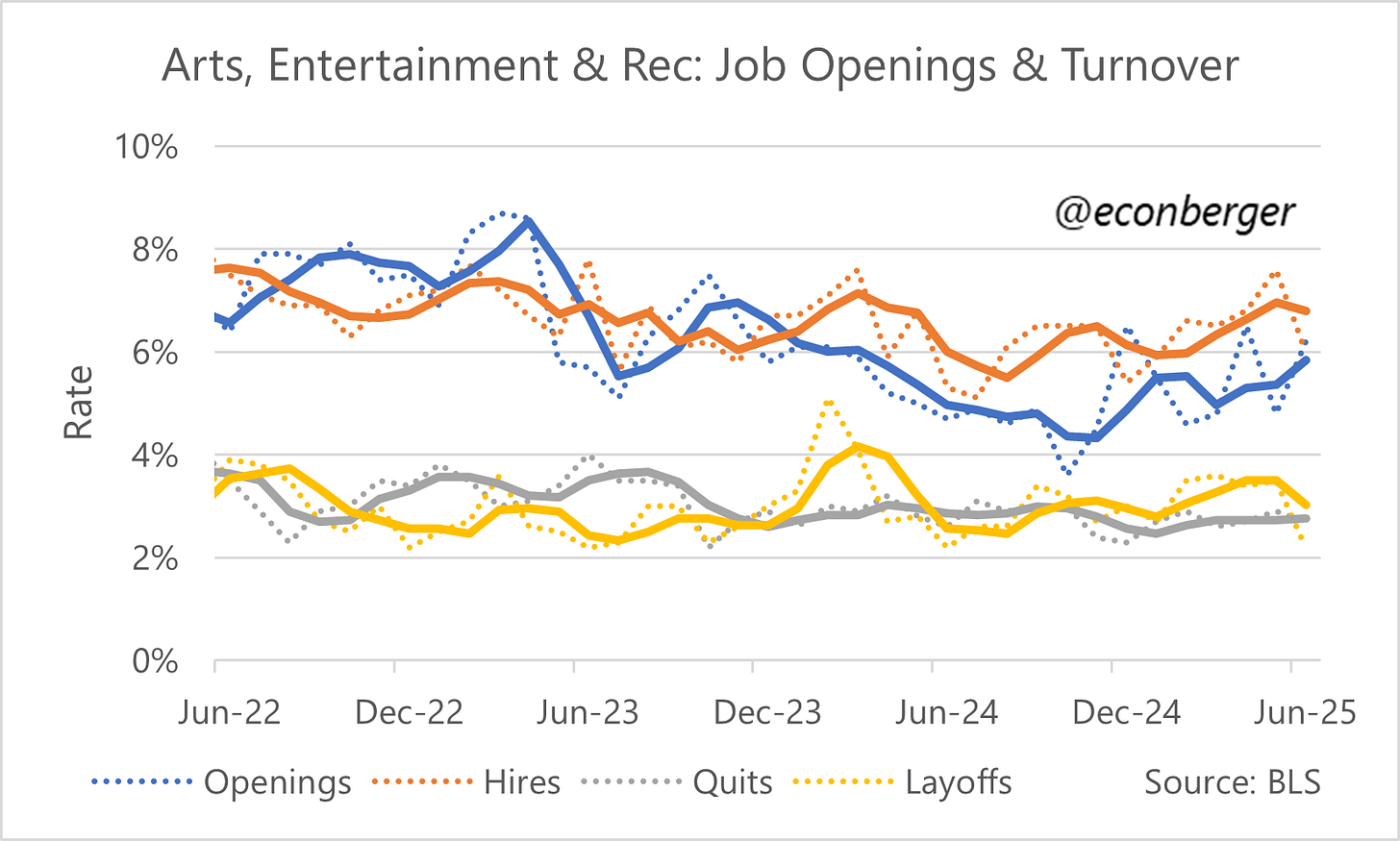 The higher-paid, smaller-headcount sibling of accommodation and food services is arts, entertainment and recreation (they share the leisure & hospitality sector). It’s less dependent on immigrants, and doesn’t register an improvement on the same scale - hires, quits, and openings are up a little, maybe.