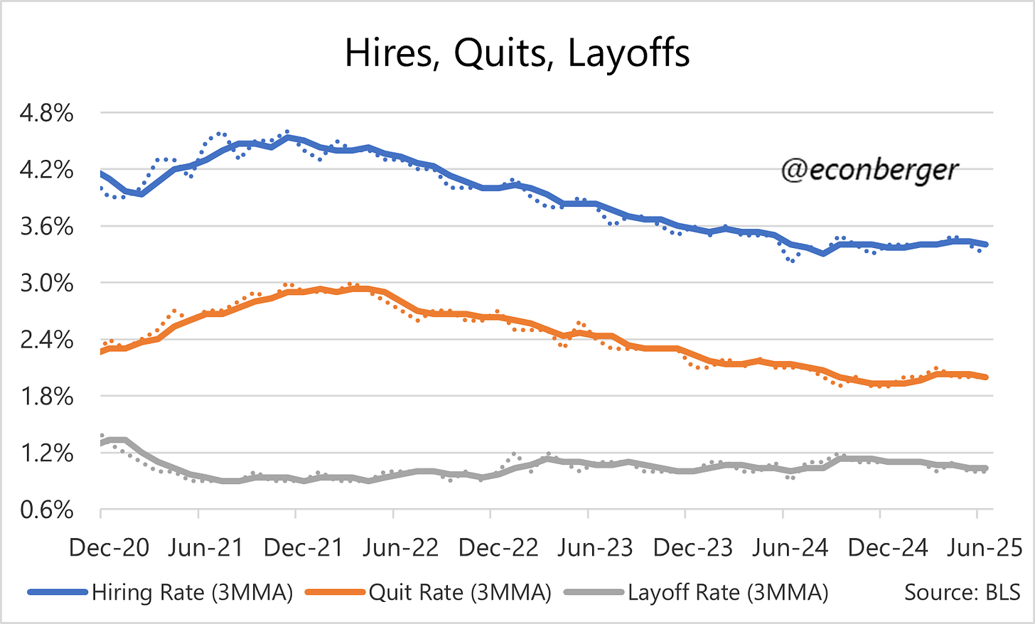 A whole host of indicators in the JOLTS report, and in the Current Population Survey, indicate that the labor market is stable: not cooling, not heating up. This is a little surprising - a month or two ago I was pretty sure that renewed cooling would be on the menu for the remainder of 2025. I still think that’s the most likely case, but I’m far less sure than I previously was.