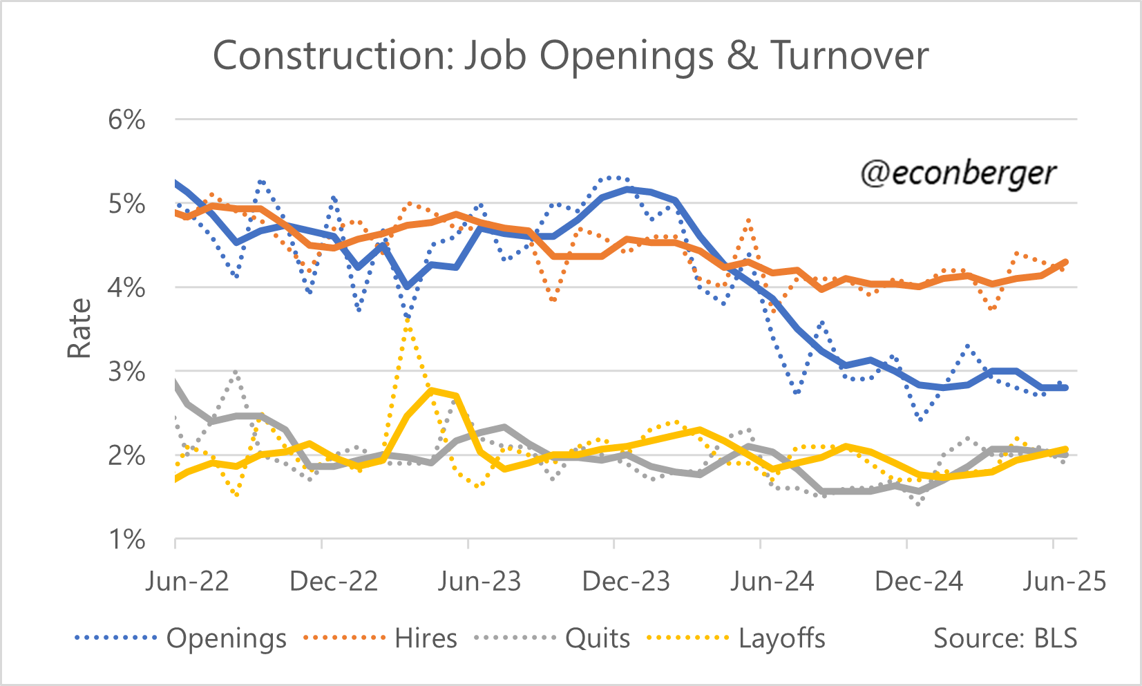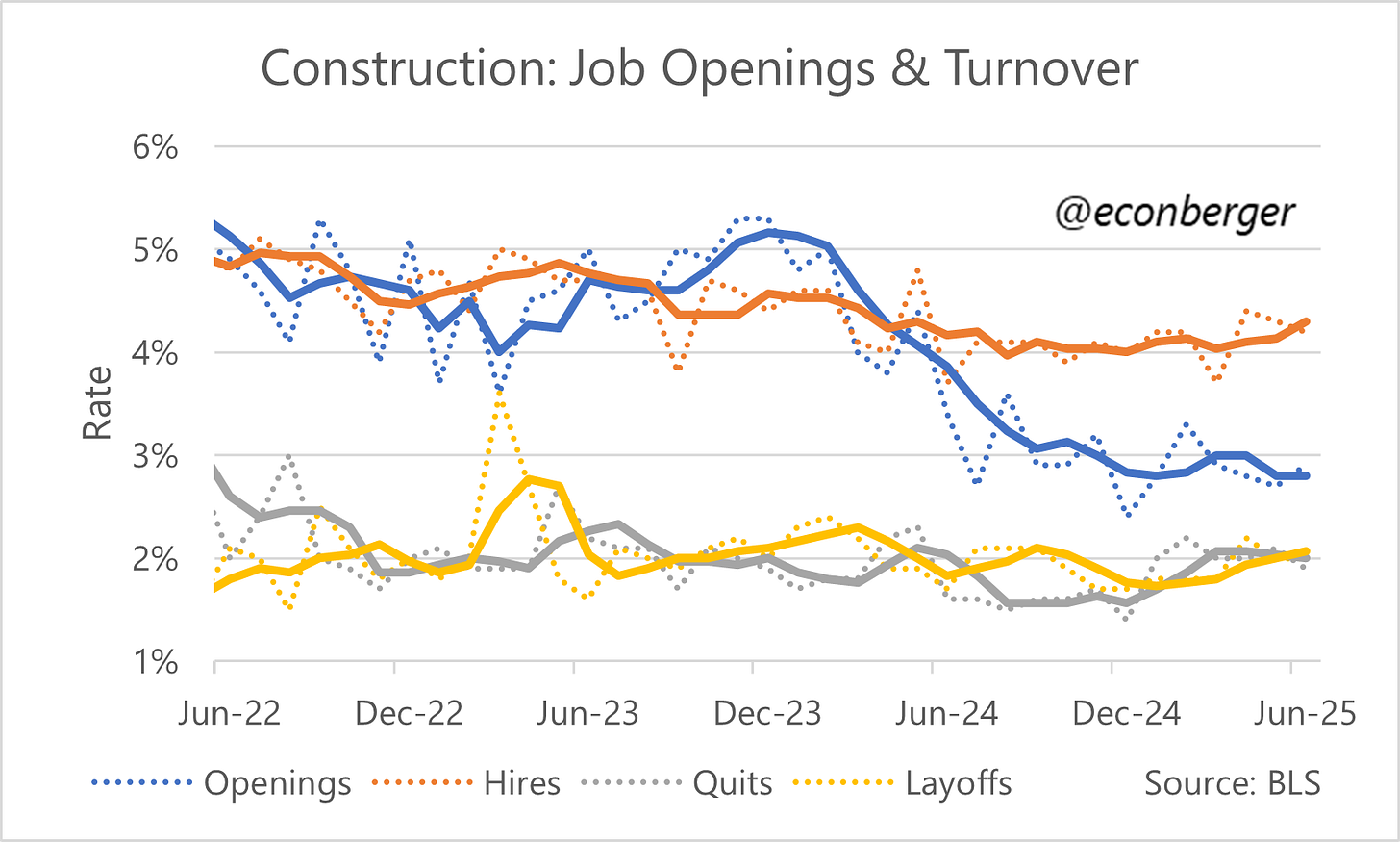 Finally, I got curious about what’s going on in construction, another immigrant-dependent sector. The answer is that hires and quits have risen recently relative to 6-9 months ago (though layoffs are too). Maybe that’s all we can hope for in a sector where aggregate spending is falling.