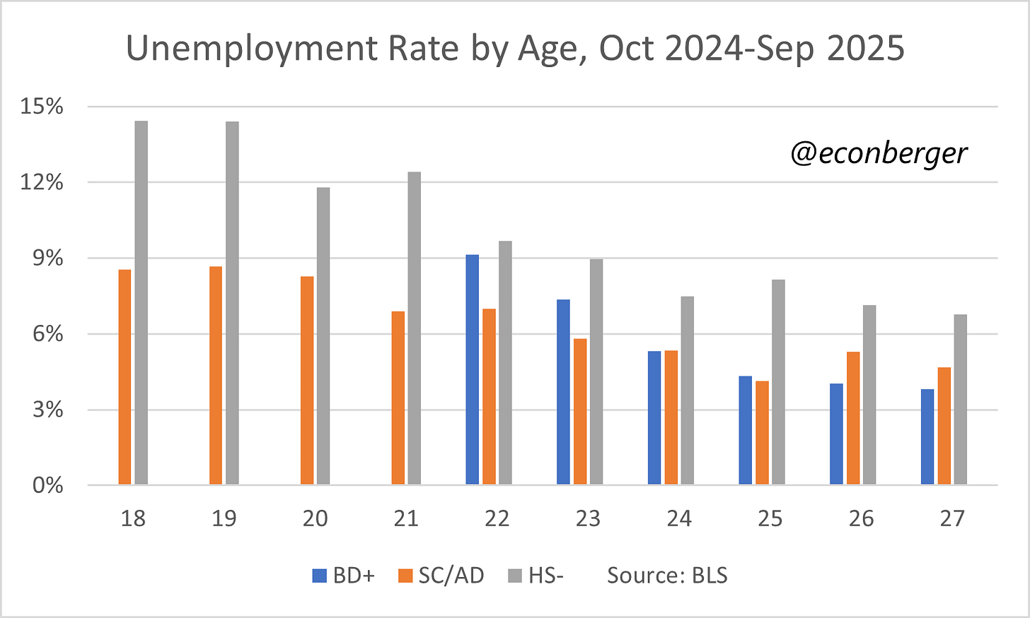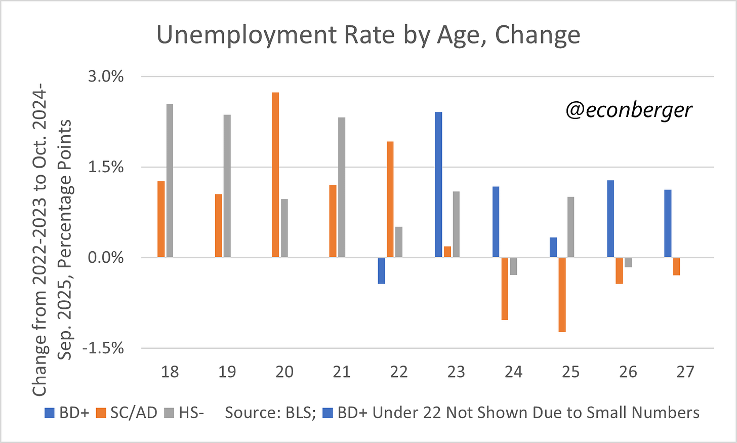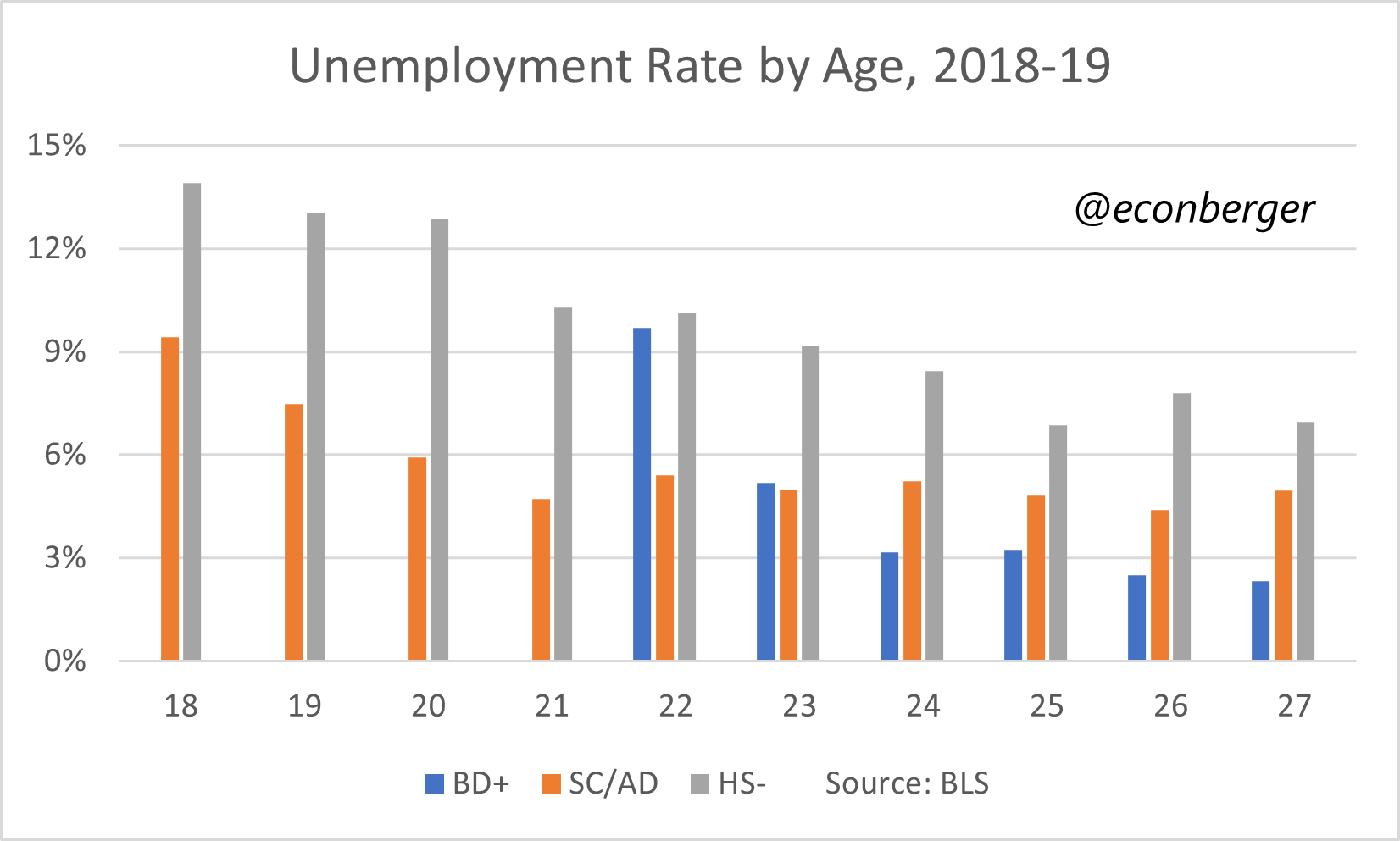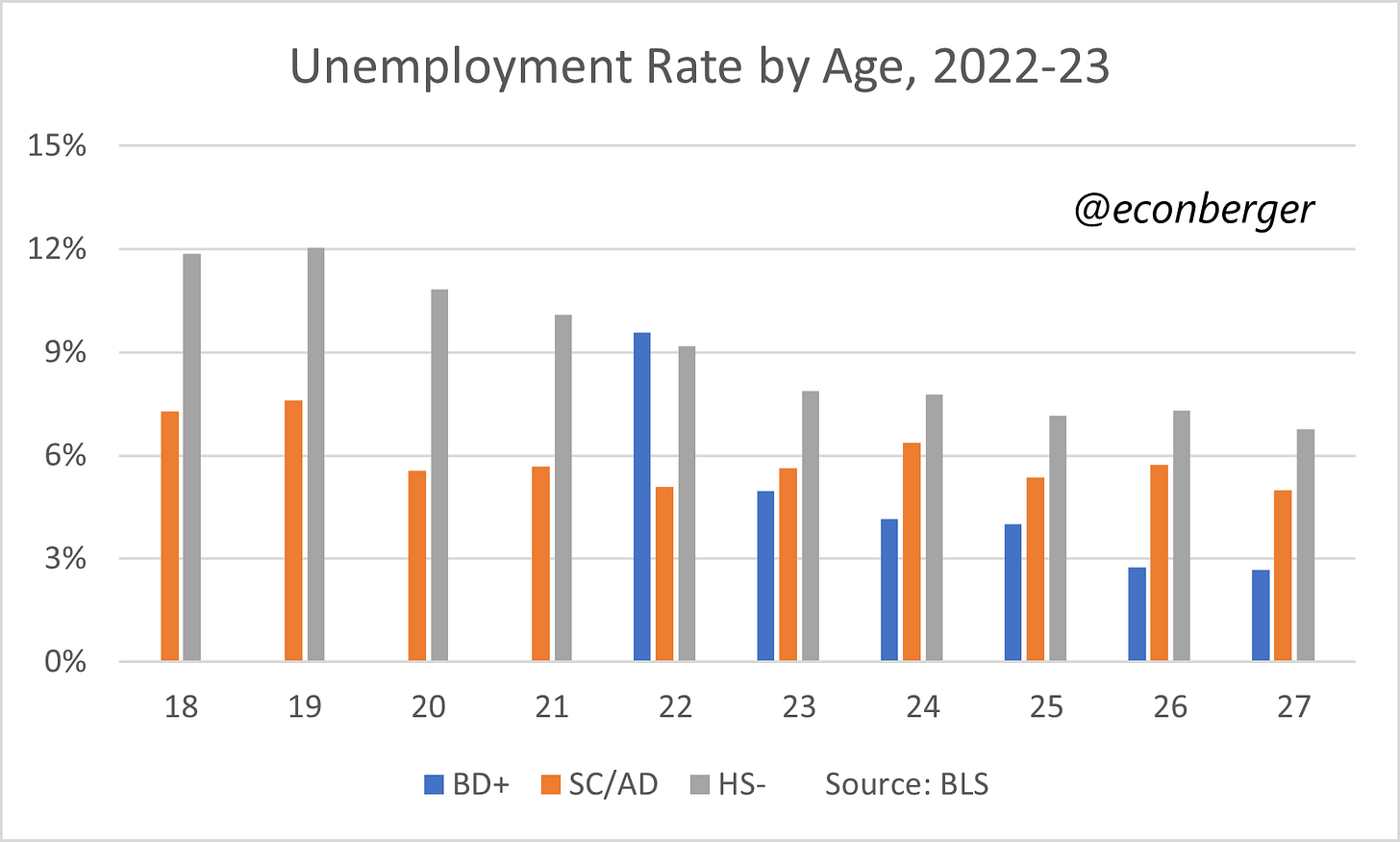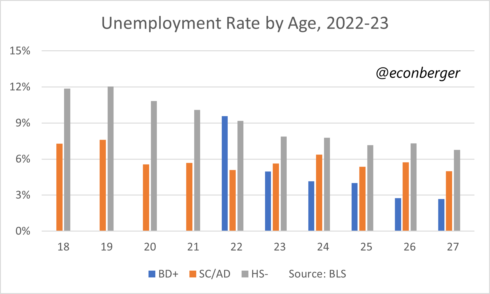 But that increase has not been uniform. For people without a college degree, unemployment rates have risen a fair amount for ages 18-22; for people with a college degree, the effect happens from ages 23 onward.2