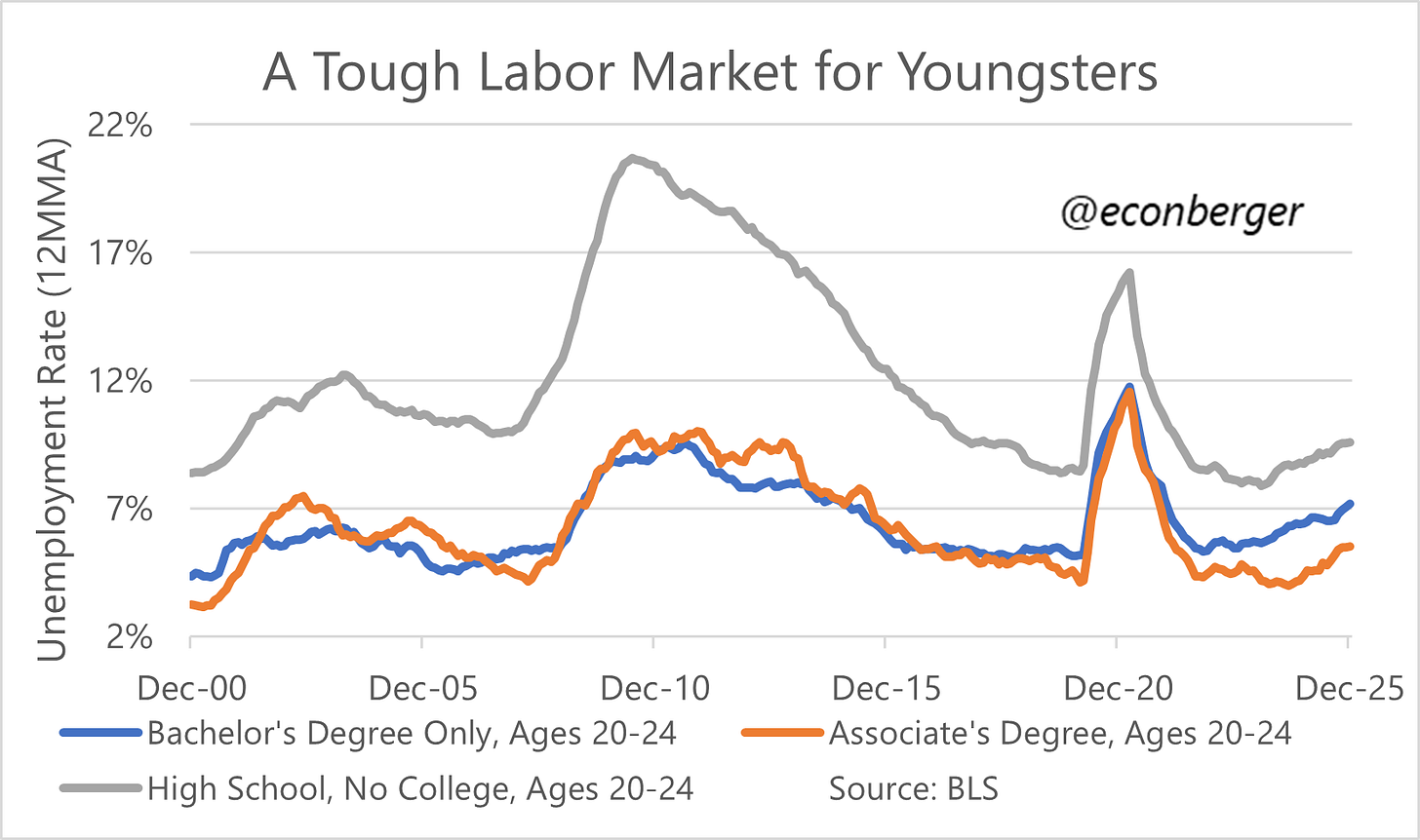 If you’ve been following econ wonk discourse (or my writing), you’ve probably seen a chart like this floating around. It shows an increase in the unemployment rate for people in their early 20s across educational groups, but also a relative deterioration in outcomes for college graduates of that age relative to their peers.