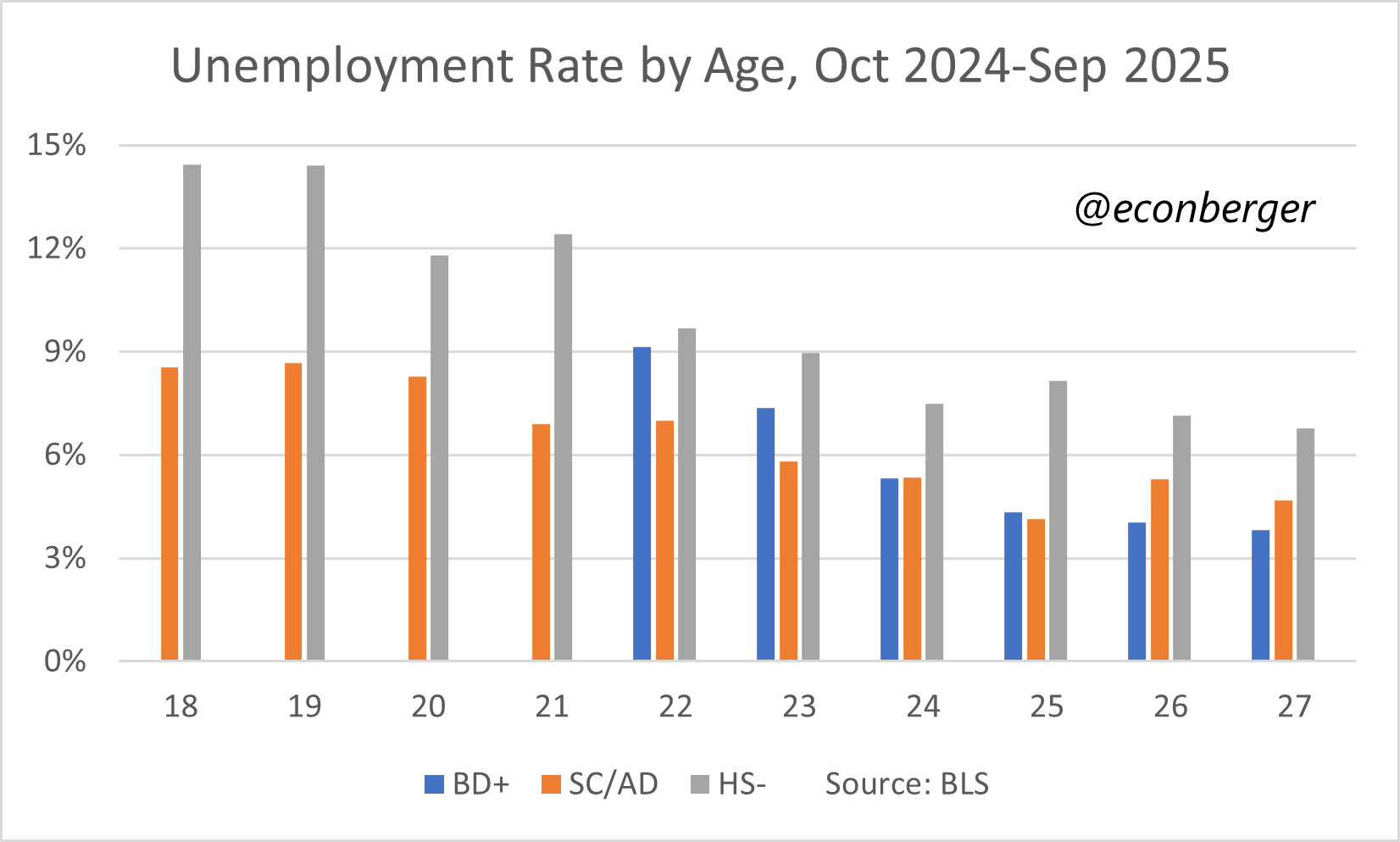 But this piece is about something slightly different: proper measurement of labor market outcomes across different educational attainment subgroups of the same age. To give an obvious example, compare a 22 year old who just finished their bachelor’s degree to one who finished high school 4 years earlier. The college grad is much more likely to be starting their career at that age. And that may almost certainly means more vulnerability to an adverse hiring environment (like the present).