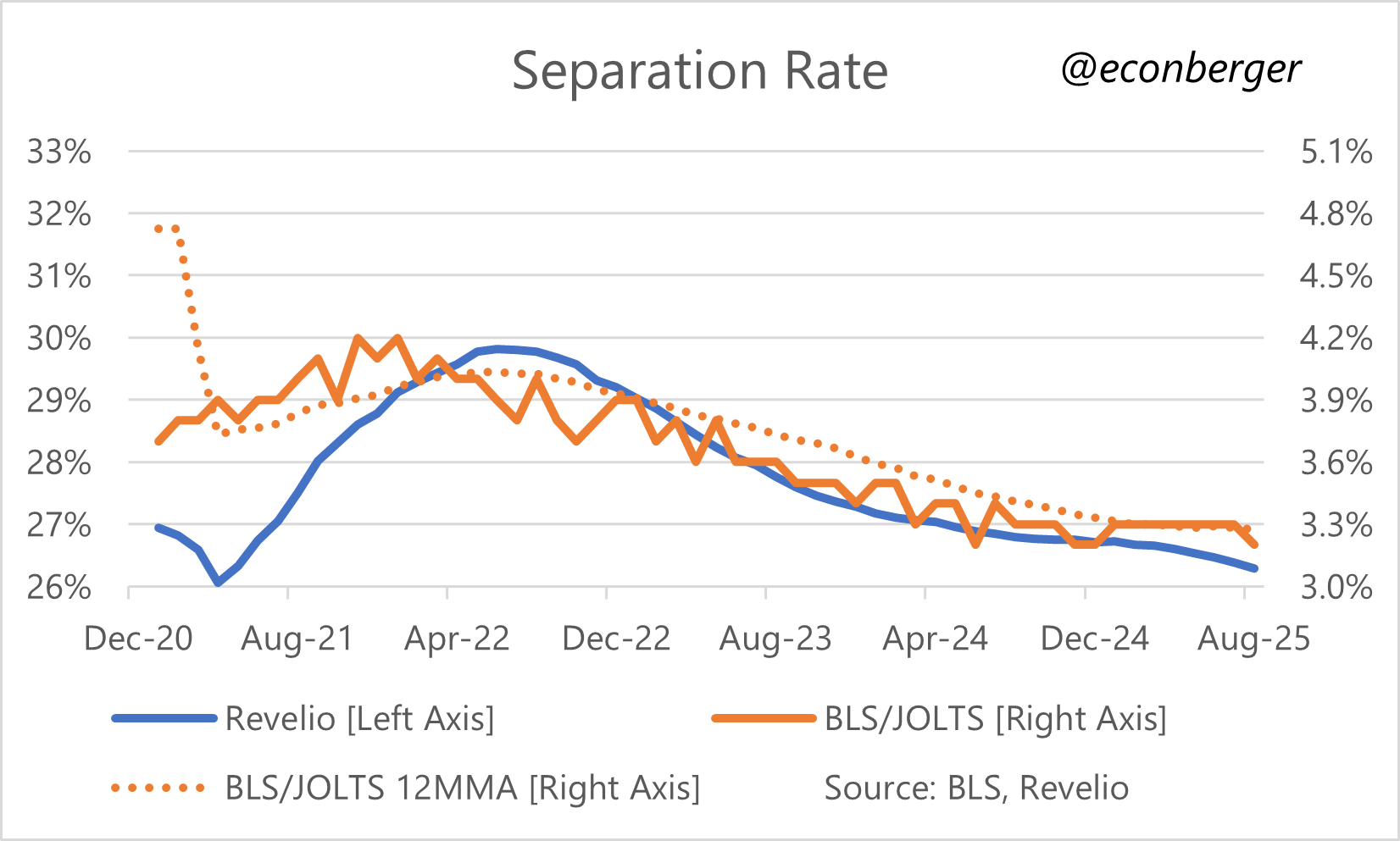 I feel good about Revelio’s correction for the hiring undercount; I am a little more concerned about their correction for the separations undercount, because such a correction is really hard! Quits reporting on LinkedIn is likely to be more timely than layoff reporting; and if the underlying frequency of layoffs and quits are changing, that means that you’ll (probably) undercount separations when layoffs are high and overcount separations when layoffs are low. So I suspect the net employment headcount will be too optimistic if we tip into a downturn. (Am open to being wrong on this!)