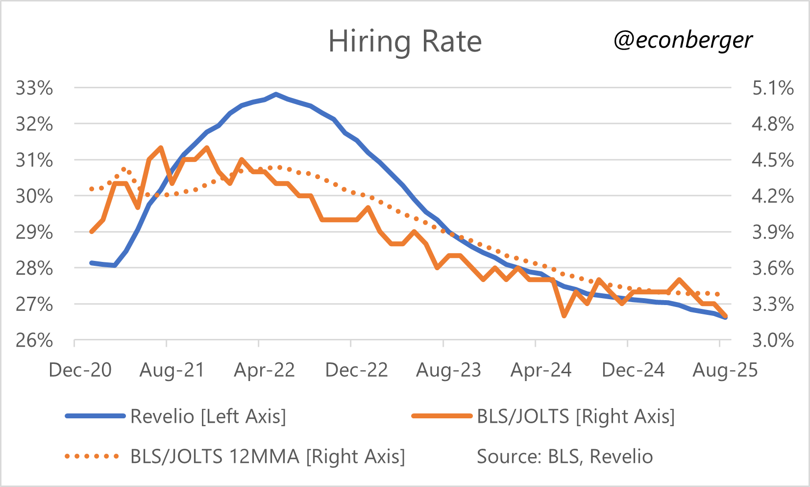 At any rate, while net employment growth will get most of the attention, I think Revelio’s hiring rate estimate, smoothed as it is, is the most valuable part of the report. Like the JOLTS hiring rate (and unlike net employment growth), it’s relatively insulated from the labor supply issue.