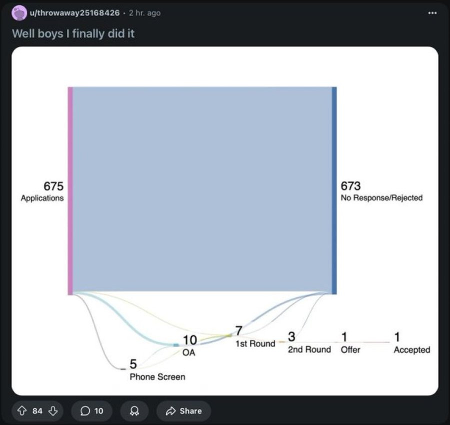 Which of these is better for the jobseeker? If you’re thinking purely in terms of time/effort consumed, they’re the same.5 But maybe jobseekers care a lot about avoiding tedious effort and are willing to take a lot of rejection (in which case the efficiency is good); or alternatively, they hate rejection and are willing to undertake a lot of tedious effort to avoid it. The amount of grumbling we see about applying hundreds or thousands of times suggests that people really hate rejection; but maybe “I spent all this time on 20 job applications and only heard back from 1” would be equally hated.