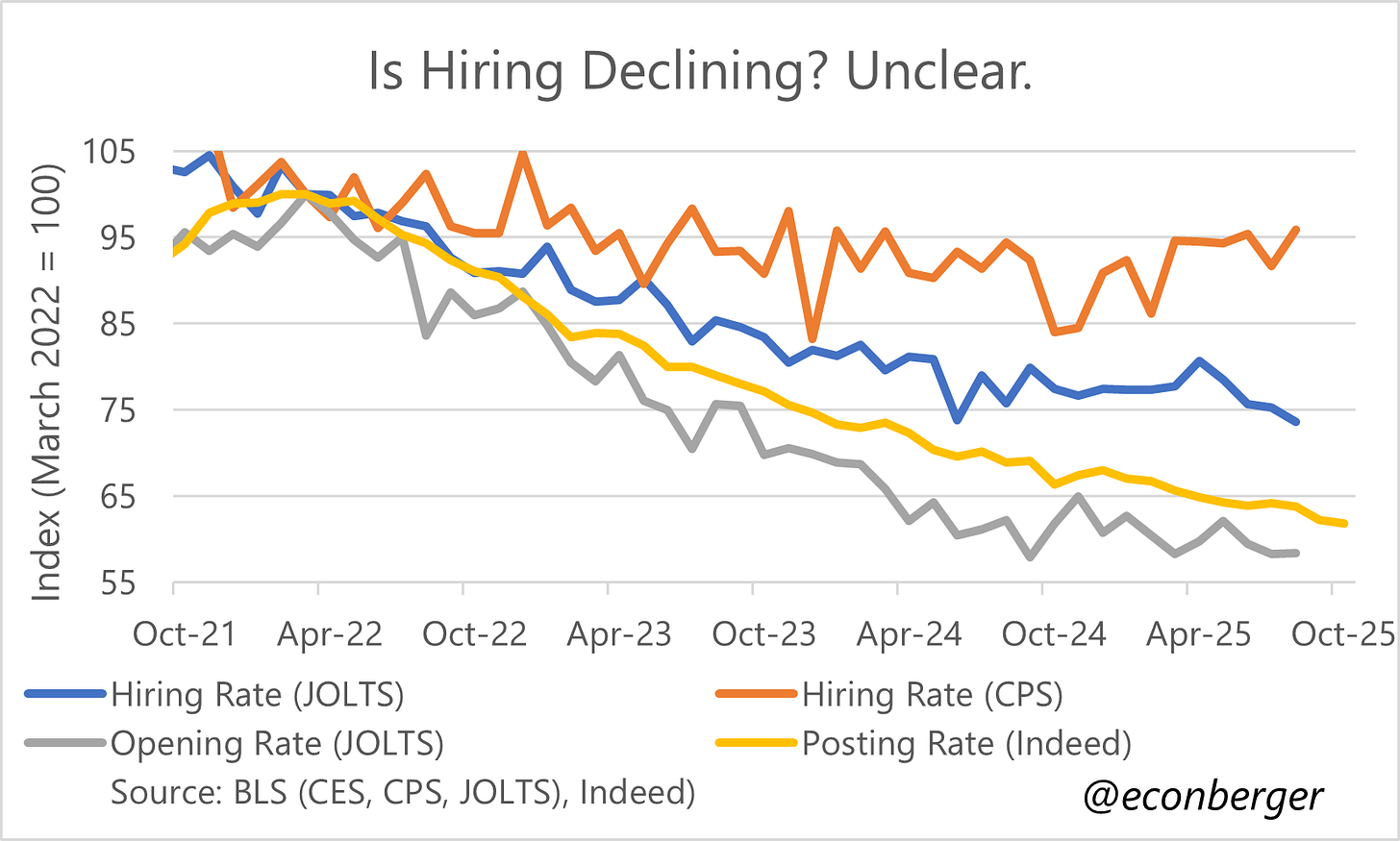 If hiring had taken a significant turn for the worse during the shutdown, I’d expect we’d see (1) a break in these trends and (2) a clear worsening across almost all of the data. Granted it’s only been 1-2 months without government data. Maybe it would add up over a longer stretch of time, and worse things could be around the corner.2 But I’m quite sure that once things take a substantial turn for the worse in the labor market, we’ll know it, BLS data or not.